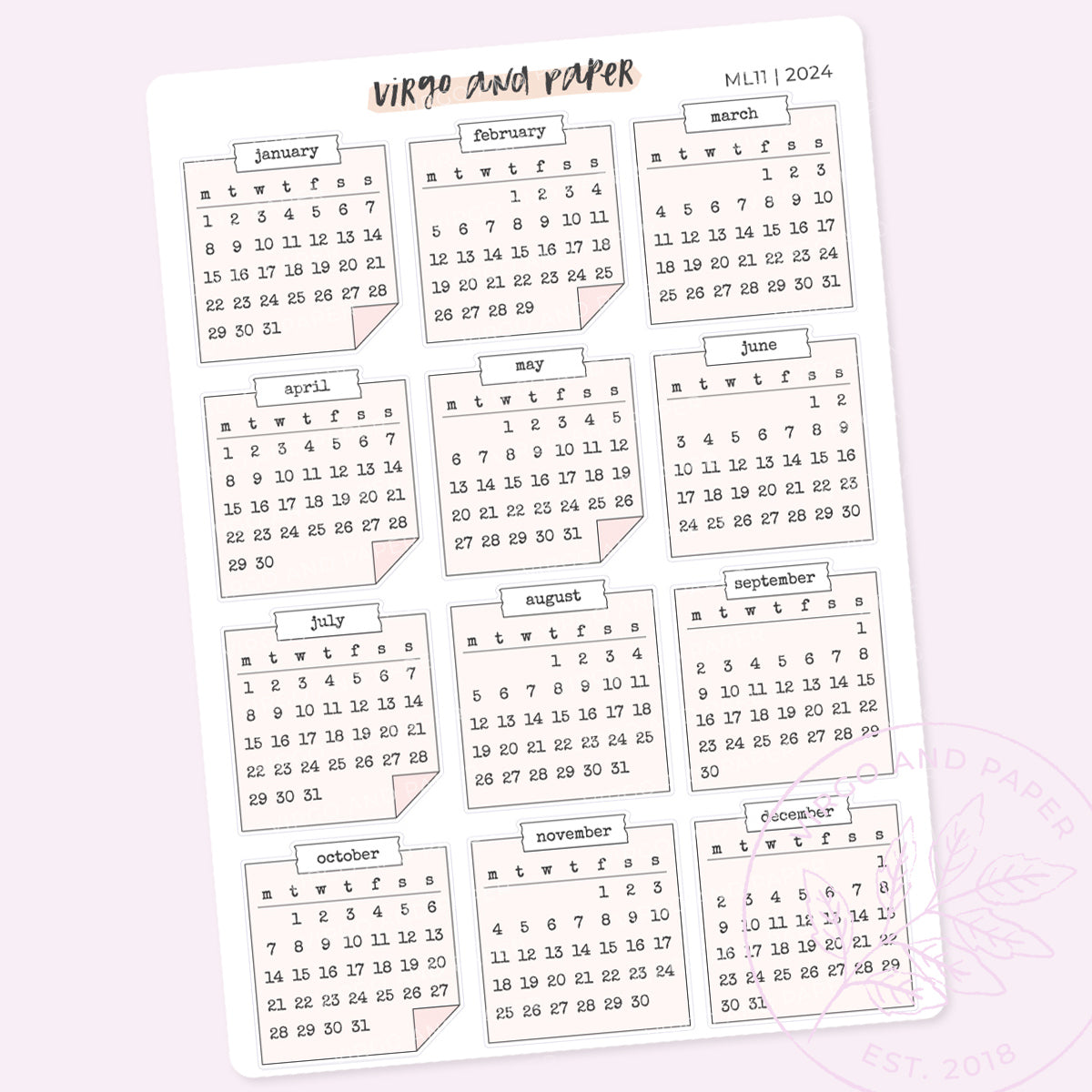Pink Calendar Stickers Jan Dec 2024 | Virgo and Paper